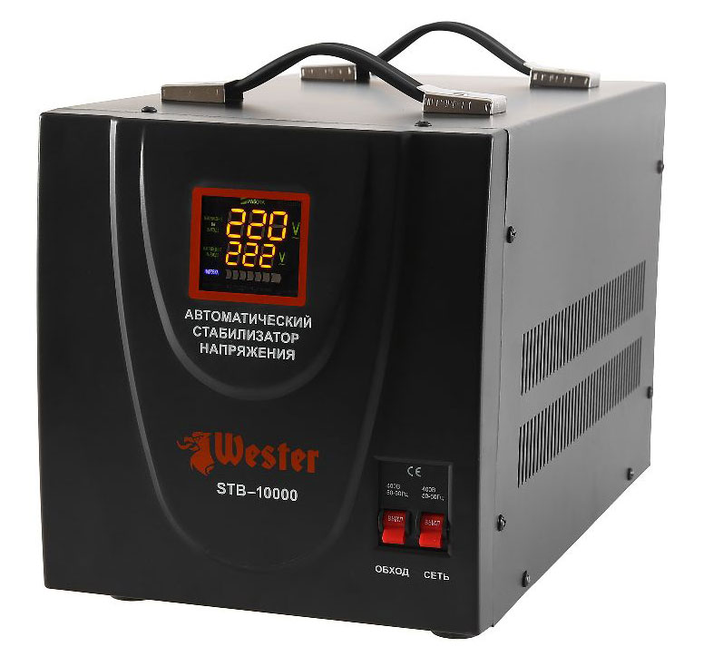 WESTER STB-10000 –релейный стабилизатор напряжения для мощного оборудования в офисе, на даче или дома. Полная мощность – 10000 ВА. Активная мощность – 8000 Вт. Достаточно для фильтрации напряжения по всей квартире, очистки тока, идущего к серверным станциям, морозильным установкам и т.д. 20% полной мощности, уходит на стабилизацию.