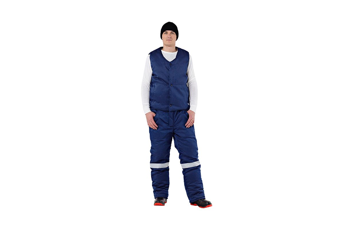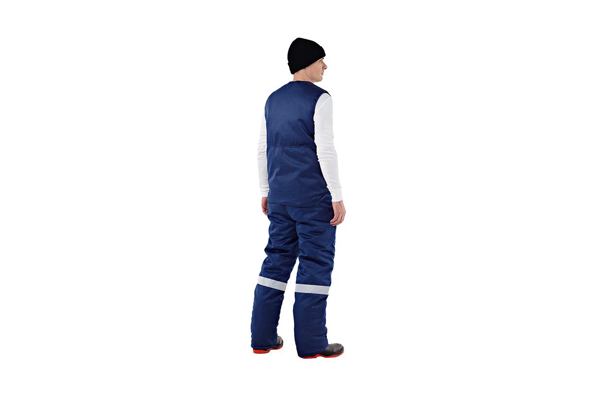 Жилет, утепленный с застежкой на три пуговицы, с заниженной спинкой, на подкладке из бязи черного цвета.