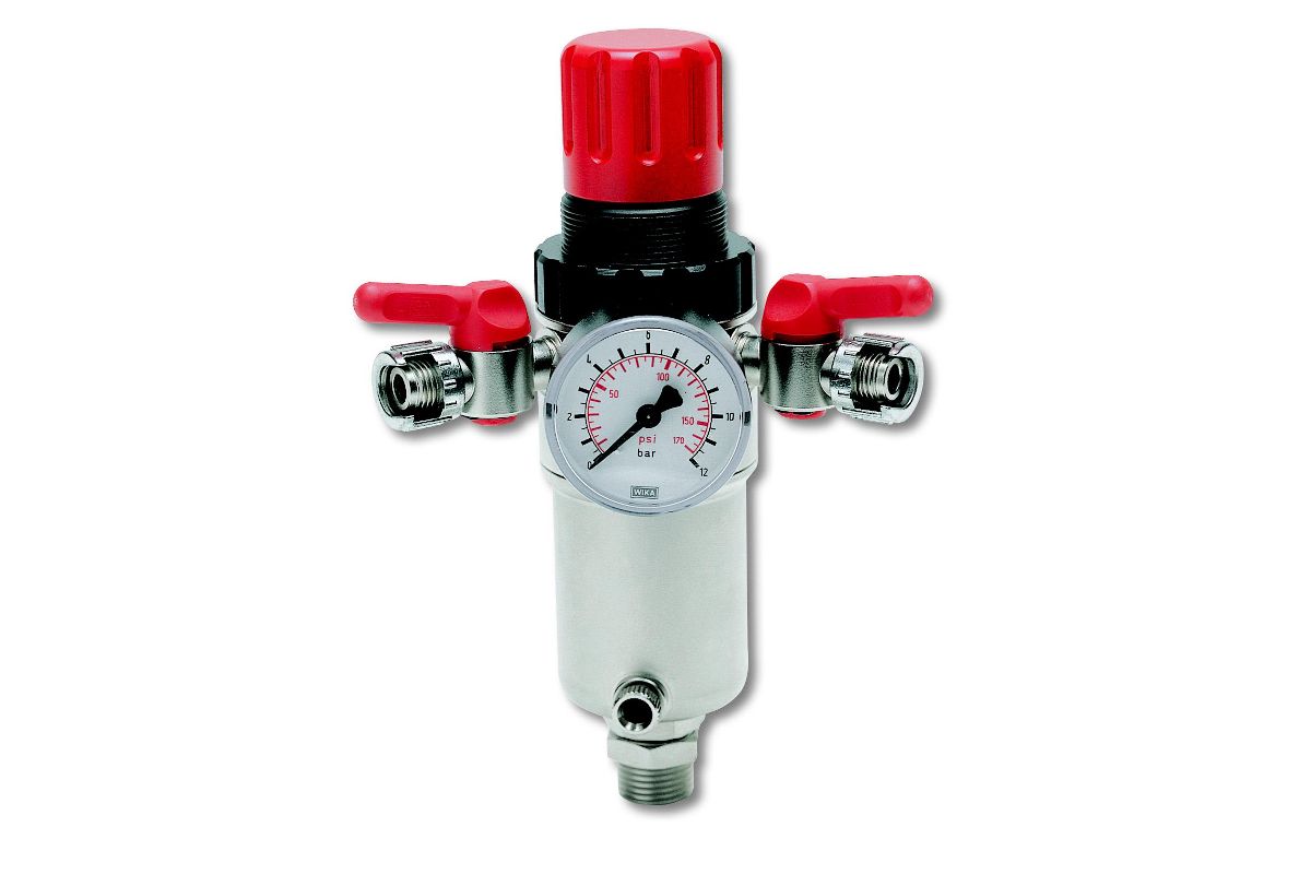 Также выполняет функцию фильтра: очищает сжатый воздух от воды, масла и пыли. Подключается к магистрали с помощью байонетного соединения. Уровень давления регулируется с помощью вентиля и отображается на встроенном манометре