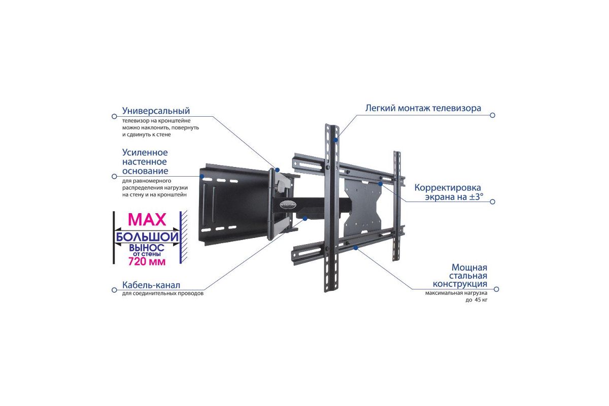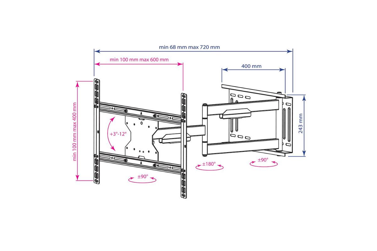 Кронштейн для LED/LCD телевизоров 32''-90'', max 45 кг, настенный, 5 ст свободы, наклон -3+12°, поворот 180°, от стены 68-720 мм, max VESA 600x400